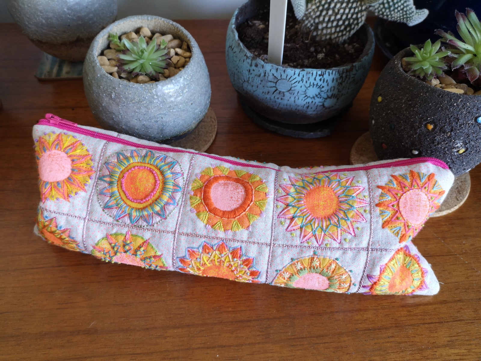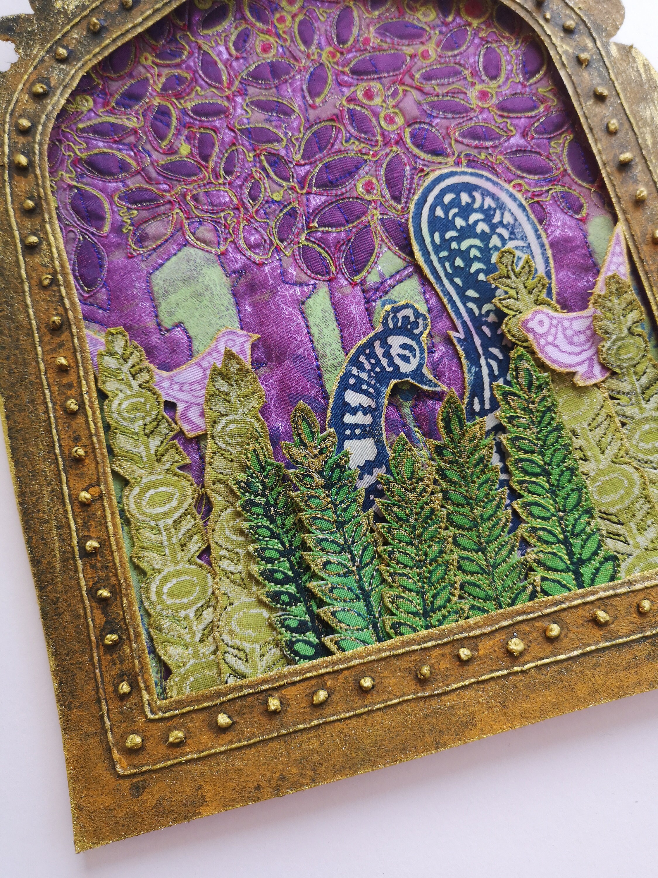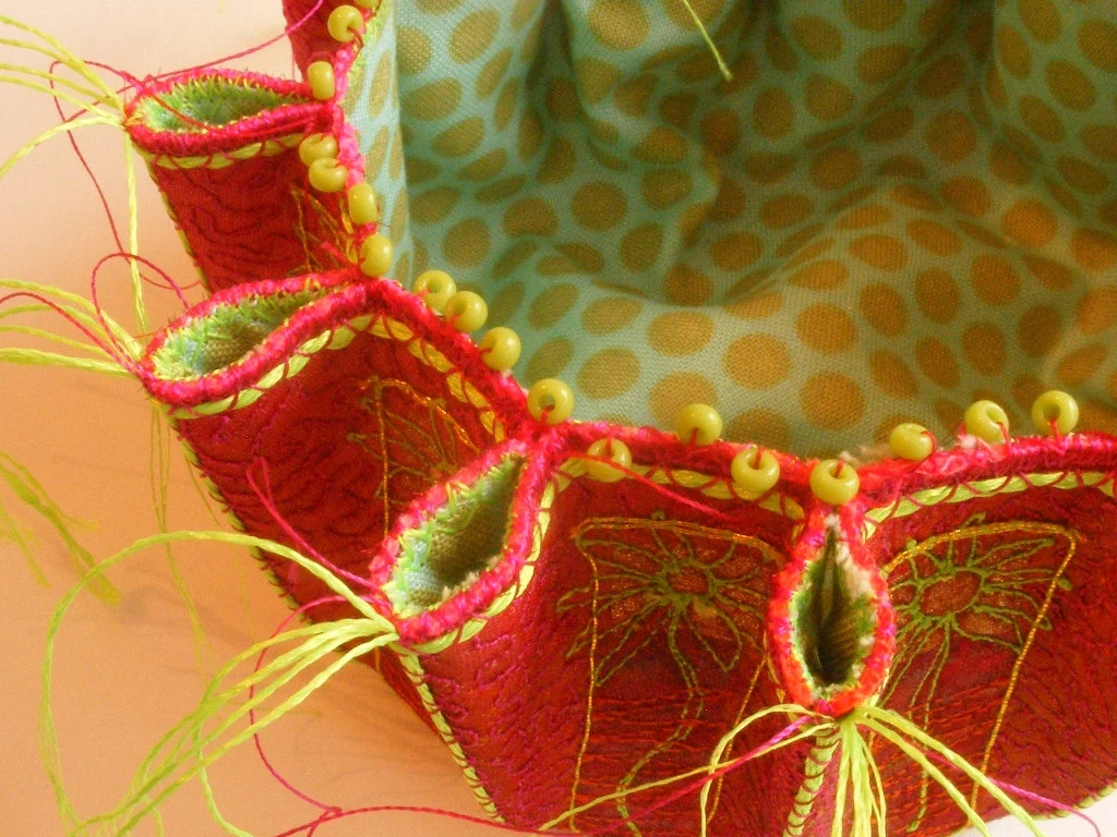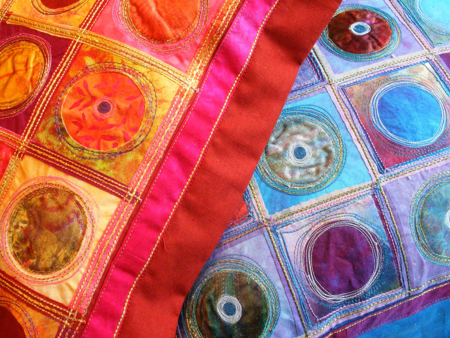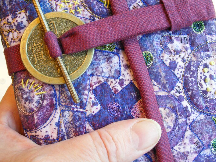 This is a workshop inspired by an embroidery i made many years ago called the ledbury wrap. It involves making a base fabric by weaving scraps together. Then over printing, in this project it has a noughts and crosses theme but it could be anything, flowers, text, simple shapes. Top of the surface with machine and hand embroidery and make into a wrap for your notebook.