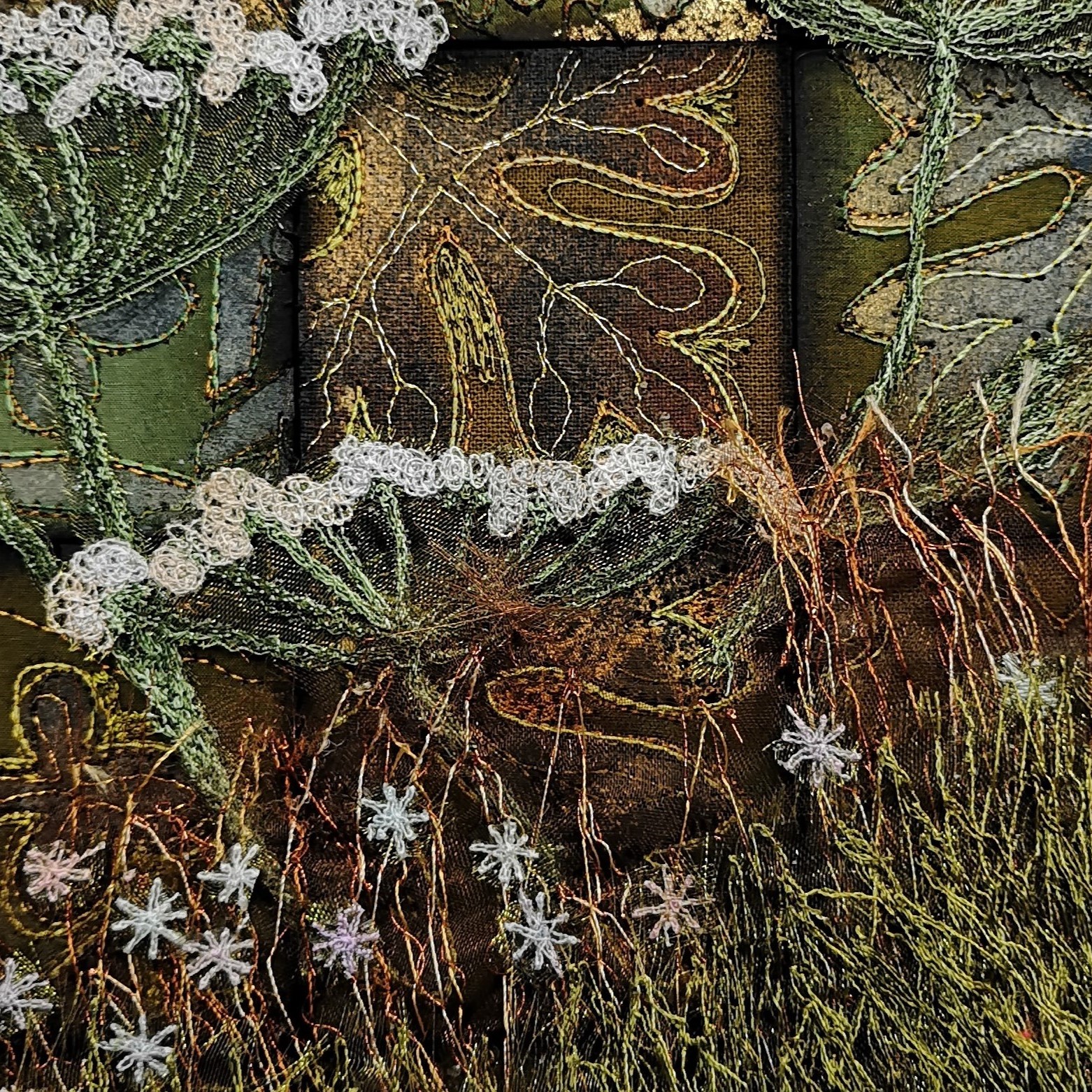 this is a workshop inspired by monastery floor tiles and the way that nature takes over abandoned buildings. it is a mixed media tutorial including stencilling, and stitch, also using machine embroidery on soluble and organza.